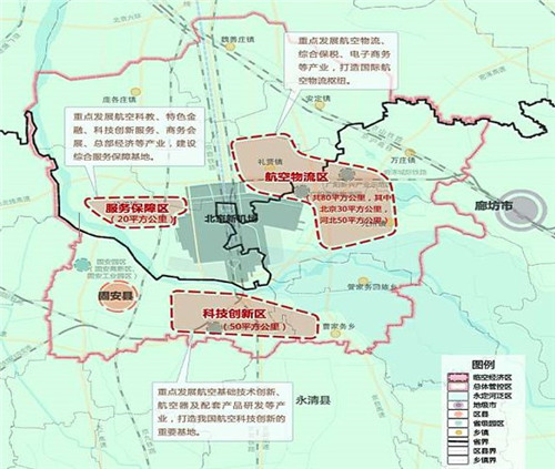 根據國家發展和改革委員會印發的《北京新機場臨空經濟區規劃(2016-2020年)》初步規劃,臨空經濟區總面積約150平方公里,其中河北部分約100平方公里,北京部分約50平方公里。
