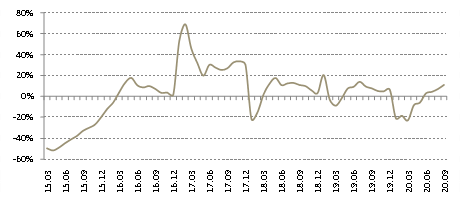 報告顯示,全國100個樣本城市在今年年初累計土地成交面積,同比增速曲線呈現V型走勢。雖然到了第三季度部分城市政策收緊,但土地交易行情依然呈現復蘇態勢。這與地方政府積極供地等因素有關。此外,今年三季度房企銷售業績總體較好,拿地態度也較積極,進而使得相關城市土地市場出現復蘇和回暖。