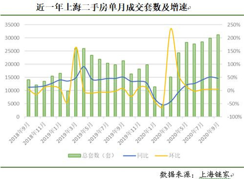 易居研究院數據顯示,9月上海二手住宅成交套數約為3.1萬套,環比增長4.2%,同比增長46.8%,處于2017年以來的歷史高位。