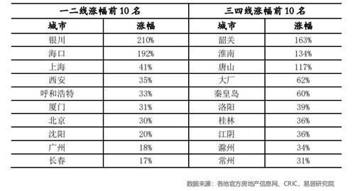 據悉,銀川在十一假期前已經出臺了房地產新政,即“銀八條”,預計后續地價將進一步趨穩。而在全國 64 個三四線城市中,韶關、淮南和唐山的地價上漲幅度較大。除此之外,包括大廠、秦皇島、洛陽、桂林、江陰、滁州和常州的地價漲幅較大,均超過了 30%的水平。