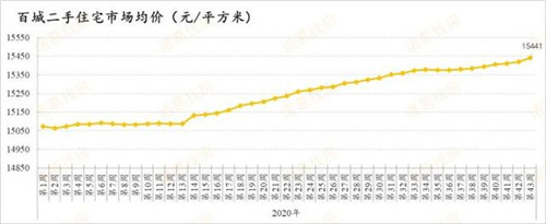 據(jù)報告,2020年第43周,百城二手住宅市場均價為15441元/平方米,環(huán)比上漲0.14%,漲幅較第42周擴大0.08個百分點。報告分析稱,4月初以來,隨著疫情的影響逐步消退,市場活力持續(xù)提升,土地、新房市場一度火熱,一定程度上帶動二手房市場預(yù)期轉(zhuǎn)好,自2020年13周以來,二手住宅價格保持上行趨勢,進(jìn)入8、9月后,隨著越來越多的城市加入調(diào)控大軍,市場價格漲幅逐漸趨穩(wěn),二手住宅市場保持穩(wěn)中有升的態(tài)勢。
