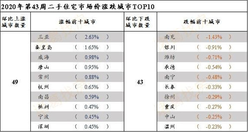 第43周,環(huán)比漲幅TOP10以珠三角、長三角、環(huán)渤海的二線和三四線城市為主。其中,珠三角經(jīng)濟圈的三亞價格漲幅為2.63%,連續(xù)兩周位居價格漲幅首位;秦皇島價格漲幅為1.65%,位居漲幅第二,威海價格漲幅為0.98%,位居第三。