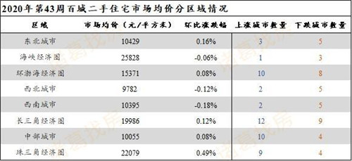 分區(qū)域來看,2020年第43周,有5個區(qū)域市場均價上漲,3個區(qū)域市場均價下跌。上漲城市中,珠三角城市市場均價為22079元/平方米,環(huán)比上漲0.49%,漲幅居首,東北城市市場均價為10429元/平方米,環(huán)比上漲0.16%,位居漲幅第二。下跌城市中,西南城市市場均價為10395元/平方米,環(huán)比下跌0.18%,跌幅居首;其次為西北城市,市場均價為9782元/平方米,環(huán)比下跌0.12%。