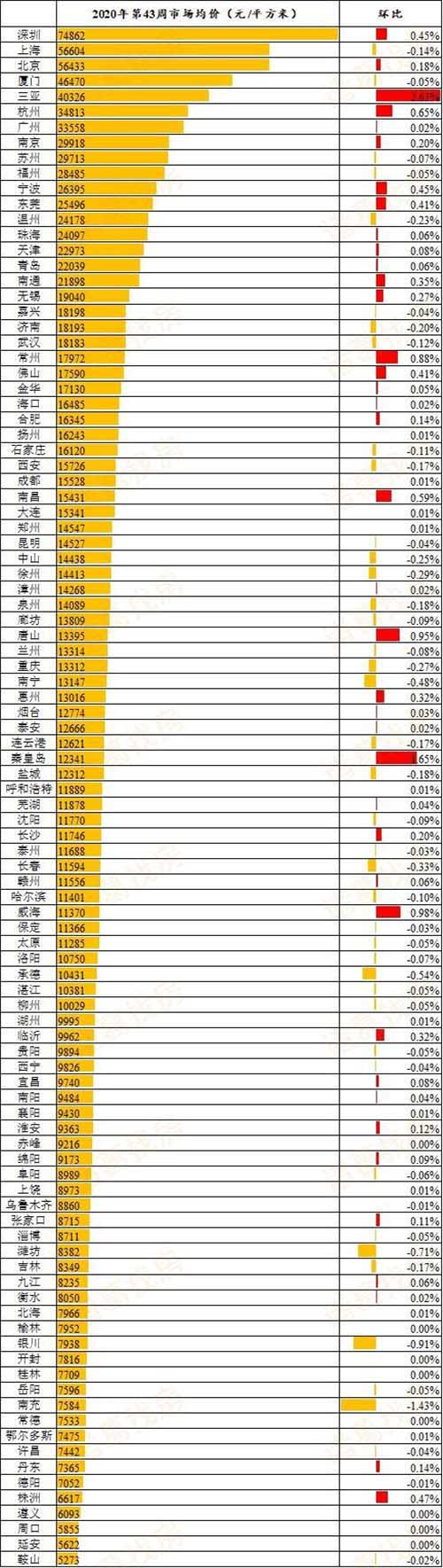 諸葛找房數(shù)據(jù)研究中心發(fā)布2020年第43周百城二手住宅市場均價報告。第43周,百城二手住宅市場均價為15441元/平方米,環(huán)比漲0.14%,漲幅較第42周擴大0.08個百分點。環(huán)比漲幅TOP10以珠三角、長三角、環(huán)渤海的二線和三四線城市為主;其中,珠三角經(jīng)濟圈的三亞價格漲幅為2.63%,連續(xù)兩周位居價格漲幅首位。
