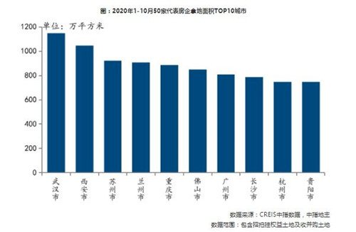 1-10月,在50家代表房企拿地面積TOP10城市中,中西部城市占6席,其中武漢、西安占據前兩位,蘭州、重慶及長沙也較受歡迎;長三角城市群有兩個核心城市上榜,蘇州、杭州分別位居第三、九位,較1-9月排名均有提升;粵港澳大灣區城市群中的佛山和廣州熱度上升,拿地面積位居第六、七位。