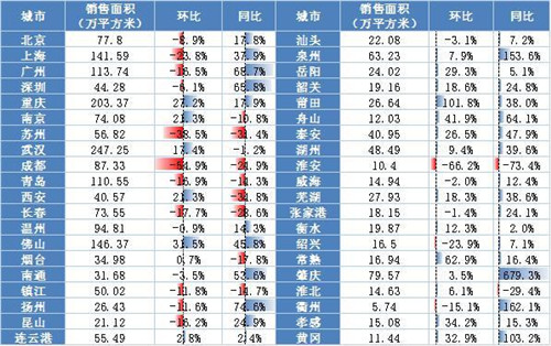 2020年10月各城市銷售面積監測。數據來源:各地住建委、房管局;整理:諸葛找房數據研究中心