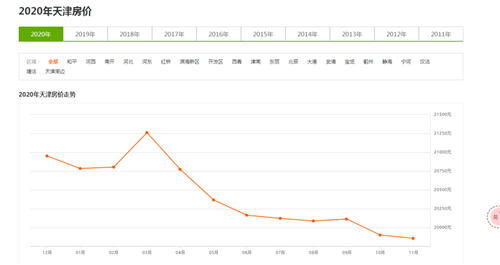 2020年3月至11月,天津房價均價呈下降趨勢(安居客數據)。