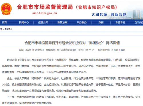 房訊網訊 據安徽省合肥市市場監督管理局消息,針對近日《今日頭條》發布的部分小區業主“抱團漲價”網絡輿情,合肥市市場監管局高度重視,11月6日,該局組織召開專題會議,研討應對之策。