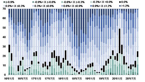 圖3:70個大中城市新建商品住宅銷售價格環比變動情況,按城市線級
