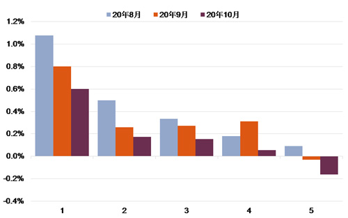 與一手市場類似,二手商品住宅價格增速亦在10月有所放緩,環比增幅從9月的0.27%降至0.11%。盡管整體而言增勢不及一手市場,但在成熟度較高的較大城市,二手住宅價格表現相對更為堅挺。其中,一線城市二手房價的同比漲幅已經連續10個月領先于一手市場;10月一線城市二手同比漲幅為7.95%,高于一手的4.10%。