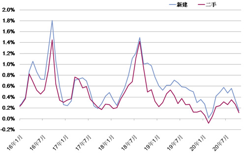 二手住宅價格繼續微幅上漲,月度環比漲幅為0.11%,較9月的0.27%略有放緩。