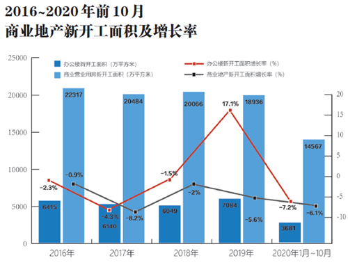 11月16日,國(guó)家統(tǒng)計(jì)局發(fā)布了2020年1-10月份全國(guó)房地產(chǎn)開發(fā)投資和銷售情況,從數(shù)據(jù)上看,無論是在投資端還是銷售端,商品住宅市場(chǎng)均明顯好于商辦物業(yè)市場(chǎng)表現(xiàn)。今年的新冠肺炎疫情雖然對(duì)房地產(chǎn)市場(chǎng)產(chǎn)生了較大影響,但是從4、5月份開始住宅市場(chǎng)即迅速反彈,表現(xiàn)出強(qiáng)勁的韌性。相比之下,商辦物業(yè)市場(chǎng)仍處在下行周期。在經(jīng)歷了2016年、2017年的大肆擴(kuò)張之后,大批商辦物業(yè)項(xiàng)目進(jìn)入入市階段,疊加因疫情對(duì)商辦物業(yè)需求的減弱,導(dǎo)致全國(guó)主要城市商辦物業(yè)供應(yīng)過剩,空置率上升,銷售端則是連續(xù)兩年出現(xiàn)兩位數(shù)的跌幅。