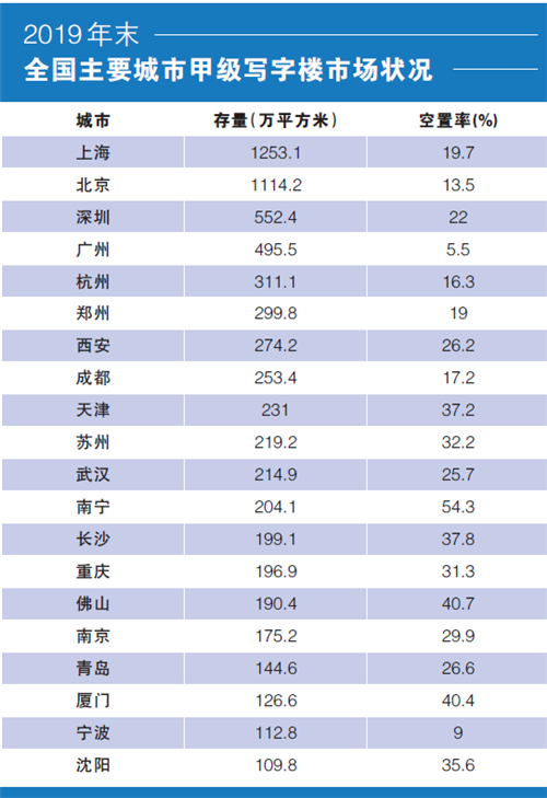 一面是連續(xù)多年的過度投資開發(fā)導(dǎo)致商辦物業(yè)產(chǎn)品過剩,一面是銷售連年下滑,雙向作用下,商辦物業(yè)空置率大幅提升。據(jù)戴德梁行的統(tǒng)計(jì)數(shù)據(jù),截至2019年末,全國(guó)20個(gè)主要熱點(diǎn)城市甲級(jí)寫字樓平均空置率達(dá)到27%。4個(gè)一線城市中,上海空置率為19.7%,北京為13.5%,深圳為22%,廣州為5.5%,除廣州外均明顯偏高。如果說基于一線城市人口吸納能力和經(jīng)濟(jì)實(shí)力,四大一線城市空置率尚在可控范圍,相比之下,二線城市空置率則高得有些離譜。圖表中顯示的16個(gè)二線城市平均空置率達(dá)到了30%。除寧波、成都、杭州、鄭州外,空置率均在20%以上,南寧的甲級(jí)寫字樓空置率達(dá)到54.3%的高位。而20個(gè)重點(diǎn)城市空置面積總和達(dá)到了6678萬平方米。