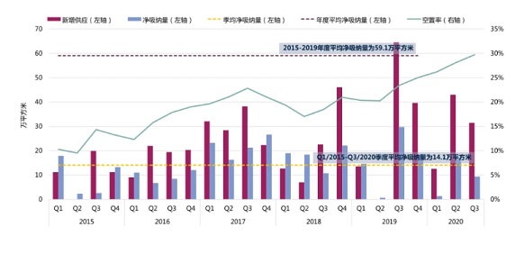 圖1:深圳甲級寫字樓供應、凈吸納量及空置率