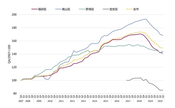 圖3:深圳甲級寫字樓子市場租金指數對比