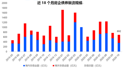 今年10月單月,房企境內(nèi)外債券融資共發(fā)行66筆,較9月份增加1筆;發(fā)行規(guī)模折合人民幣約692億元,較9月份下降10.7%。其中,境外融資共發(fā)行19筆,融資規(guī)模約332億元人民幣,環(huán)比增長46.9%;境外債券規(guī)模占比約48%,較9月份提升19個百分點(diǎn),主要是10月后兩周境外債市表現(xiàn)出波動性活躍。