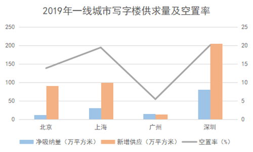 在供求方面,從2019年全年來(lái)看,除廣州外,我國(guó)一線城市吸納量均小于新增供應(yīng)量,供求關(guān)系的不平衡成為了北上深三地空置率較高的原因之一,直接拉動(dòng)空置率上升。其中,深圳的凈吸納量和新增供應(yīng)量均位居一線城市之首,達(dá)200萬(wàn)平方米以上的新增供應(yīng)量給市場(chǎng)去化帶來(lái)了不少壓力。