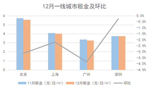 在寫(xiě)字樓租金方面,12月,我國(guó)一二線城市的寫(xiě)字樓日租金排行依次是北京、上海、深圳、廣州,總體而言維持較為穩(wěn)定的狀態(tài),雖環(huán)比均有輕微下降,但幅度在正常區(qū)間內(nèi),其中深圳的降幅最小,廣州的降幅最大。