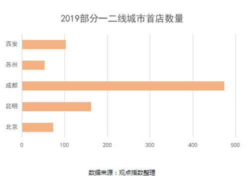 在激烈競爭中,首店經濟依然是不少購物中心用于吸引顧客的重要戰略。據觀點指數不完全統計,在過去的2019年,我國的部分重要一二線城市均有大量首店業態進駐購物中心。其中,成都數量最多,緊隨其后的是昆明,其次分別是西安、北京、蘇州。