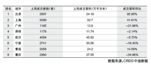北京、上海、南京等重點監測的22個城市成交面積環比上升3%。其中,12個城市成交環比上升,占監測城市的55%;與去年同期相比,22個代表城市成交量整體上升21.8%,其中16個城市成交同比上升。