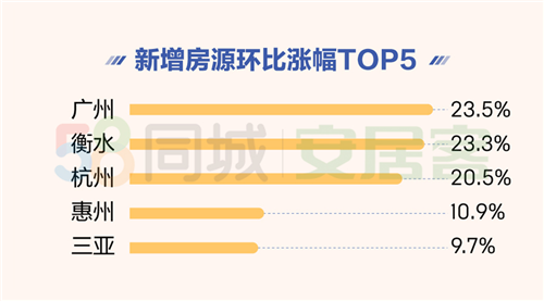 從市場供應情況來看,全國新增掛牌二手房源量環比下跌4.1%,一線城市中,廣州新增掛牌量環比增幅高達23.5%,排名全國第一,而北京、上海、深圳新增掛牌量則有所下降。從全國范圍來看,衡水、杭州、惠州、三亞新增掛牌房源量環比均有所上升,衡水僅次于廣州,實現了23.3%的環比增幅。