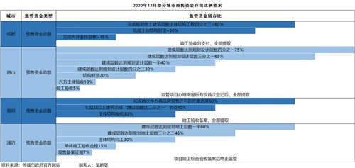 從預售資金的留存比例看,對于取得預售許可證、建設層數、主體結構封頂、竣工驗收、交付使用等不同節點,不同城市的的監管留存比例也有所差異。