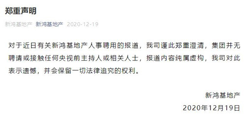 12月19日,新鴻基地產官方微信公眾號對外發布消息稱,對于近日有關新鴻基地產人事聘用的報道,公司謹此鄭重澄清,集團并無聘請或接觸任何央視前主持人或相關人士,報道內容純屬虛構,公司對此表示遺憾,并會保留一切法律追究的權利。