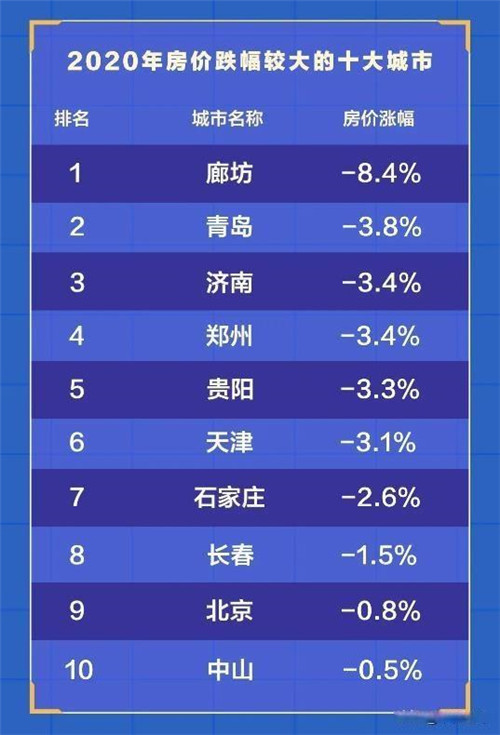 房?jī)r(jià)跌幅榜單中,廊坊以8.4%的跌幅居于榜首,廊坊房?jī)r(jià)仍未走出2017年以來的下跌通道,今年疫情之下,房?jī)r(jià)跌幅同比擴(kuò)大。山東省頭部城市青島、濟(jì)南房?jī)r(jià)跌幅分列榜單第二、第三位。房?jī)r(jià)下跌的以北方城市為主,TOP10中占據(jù)8席。貝殼研究院指出,總體上,房?jī)r(jià)跌幅與城市發(fā)展基本面及人口吸引力負(fù)相關(guān)。