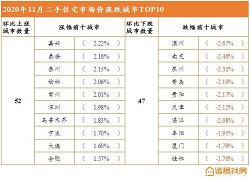據《月報》,11月份二手住宅市場均價上漲城市52個,較上月增加5個,平均漲幅0.84%,漲幅擴大0.37個百分點;下跌城市47個,較上月減少4個,平均跌幅為1.05%,跌幅擴大0.66個百分點;持平城市1個,較上月減少1個。11月上漲城市數量增加,隨著10月份“以價換量”潮的褪去,上漲城市數量恢復至往日水平。
