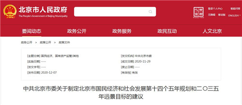 12月7日,中共北京市委發布中國共產黨北京市第十二屆委員會第十五次全體會議通過的《關于制定北京市國民經濟和社會發展第十四個五年規劃和二〇三五年遠景目標的建議》。