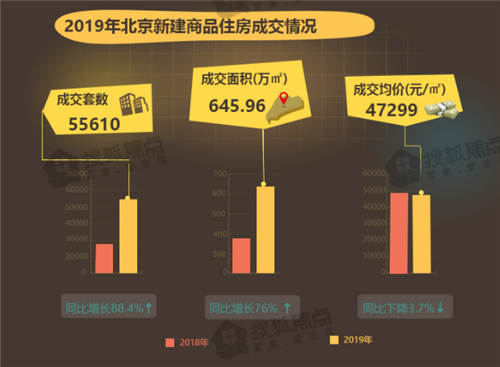 2019年北京新房市場呈“成交暴漲、房價微跌”態(tài)勢。全年共成交新房55610套,同比增長88.4%;成交面積645.96萬㎡,同比增長76%;成交均價為47299元/平,同比降低3.7%。其中普宅市場成交面積、成交套數(shù)同比均大幅上漲,僅成交價格有小幅下降;別墅市場表現(xiàn)不俗,成交套數(shù)、成交面積、成交均價均有明顯提升。