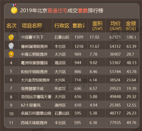位列2019年成交套數(shù)前10的11個項目中(翡翠山曉和西城天鑄均為595套,并列第10),除位居榜首的中海寰宇天下和K2十里春風項目,其余9個項目均為限競房產(chǎn)品,可以看出在2019年的新房市場,限競房占據(jù)主導(dǎo)位置;而在區(qū)域分布中,位于南城的項目總計7個,其中大興區(qū)4個項目、豐臺區(qū)2個項目、通州區(qū)1個項目。可見隨著新機場的開通、南城計劃有條不紊地實施落地,購房人置業(yè)南城的態(tài)度明顯加強,預(yù)計在未來1-2年內(nèi),南城將再迎來一波購房熱。