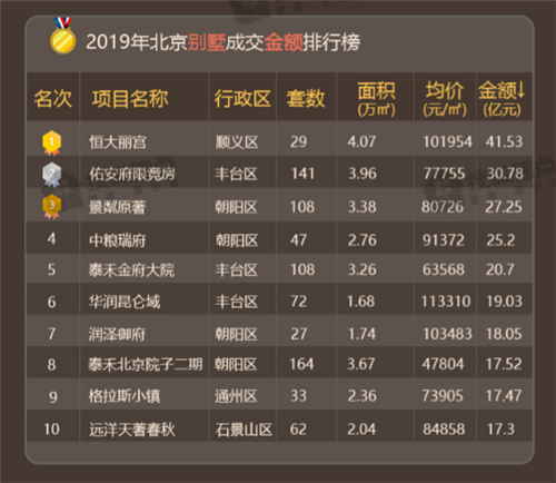 2019年,別墅市場表現(xiàn)不俗,成交4323套,同比增長33.1%,成交均價也由2018年的49546元/平上升到55311元/平,成交套數(shù)排行榜中,占據(jù)前三名的分別是金隅上城郡、泰禾北京院子二期和和棠瑞著限競房,成交套數(shù)分別是169套、164套、159套;而在成交總價上,前三名分別是恒大麗宮、佑安府限競房和景粼原著,銷售金額依次為41.53億元、30.78億元、27.25億元。