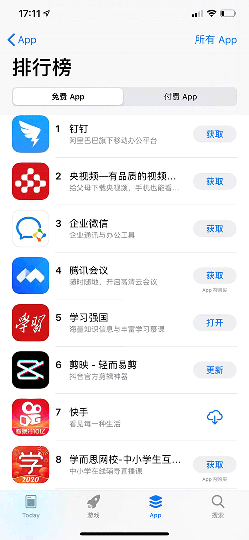 原標(biāo)題:疫情之下,移動(dòng)辦公市場開啟爭奪戰(zhàn),阿里釘釘首超微信,躍居蘋果應(yīng)用商店排行榜第一