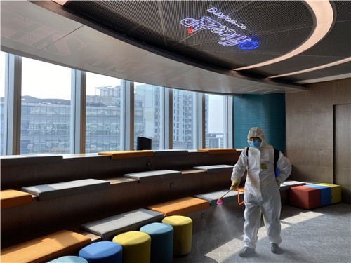 (2)重點位置消殺: OFFICEZIP嚴苛、細化的全方位高標準進行消毒,消毒點位包括但不限于大堂、電梯按鈕、電梯轎廂、辦公區、衛生間、垃圾房等區位。