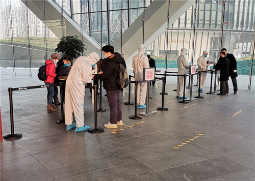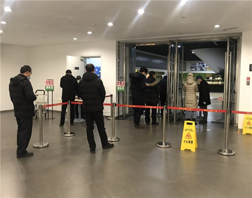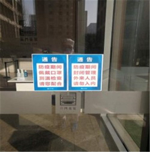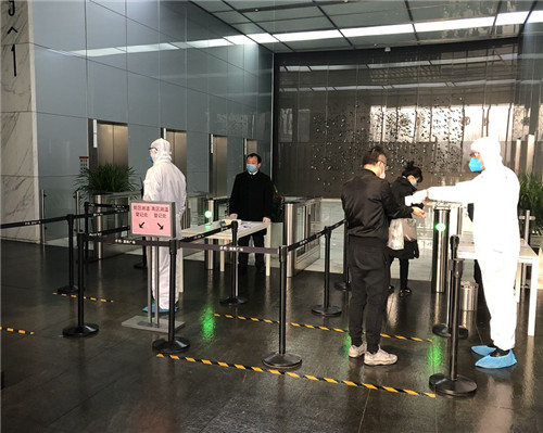 大堂、車庫入口測溫處設置隔離室,大堂開啟南/北兩側平推門,關閉多功能旋轉門;布置客服、安防人員雙崗測溫、紙質登記、消毒;根據客戶提供到廈上班員工名單對來人員進行核實后放行,并發放出入證。