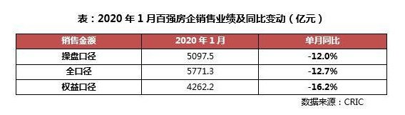 即使是受到疫情沖擊較小的1月份,多數(shù)房企的銷售業(yè)績(jī)也表現(xiàn)低迷。克而瑞數(shù)據(jù)顯示,今年1月百?gòu)?qiáng)房企實(shí)現(xiàn)操盤口徑銷售金額5097.05億元,整體業(yè)績(jī)規(guī)模較去年同期降低近12%。