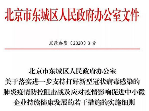 房訊網訊 2月13日,北京東城區發布《東城區關于落實進一步支持打好新型冠狀病毒感染的肺炎疫情防控阻擊戰及應對疫情影響促進中小微企業持續健康發展的若干措施的實施細則》。