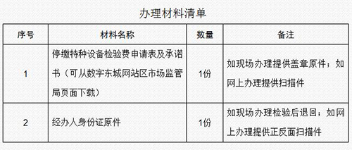 辦理方式:(1)網上辦理。將辦理材料的電子版(掃描或照片均可)發至特種設備檢驗機構受理信箱(dcjtjs@scjgj.beijing.gov.cn),由檢驗機構審核通過后,即可停征。