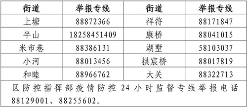 疫情防控人人有責,根據(jù)《中華人民共和國傳染病防治法》,為進一步加強對重點地區(qū)、重點人員的排查管控工作,在防控指揮部已有的24小時舉報電話的基礎(chǔ)上,現(xiàn)新增各街道監(jiān)督舉報專線電話(工作時間 9:00-22:00,詳見附表)。請居民朋友積極主動提供相關(guān)信息。主要反映以下情況: