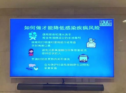 為更好的保證客戶安全,在電梯內、公共區域等多媒體上,及時跟進、宣傳防疫措施及注意事項,提醒員工及客戶做好防護,引導大家齊心協力,共戰“疫”情。