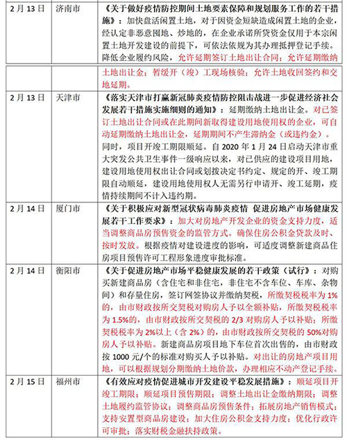 其中,福州市發(fā)布《有效應(yīng)對(duì)疫情促進(jìn)城市開(kāi)發(fā)建設(shè)平穩(wěn)發(fā)展措施》,10條措施在延緩?fù)恋爻鲎尳鹄U納期限的同時(shí),明確加大信貸支持力度,降低企業(yè)融資成本,對(duì)還貸困難的企業(yè)給予展期或續(xù)貸。