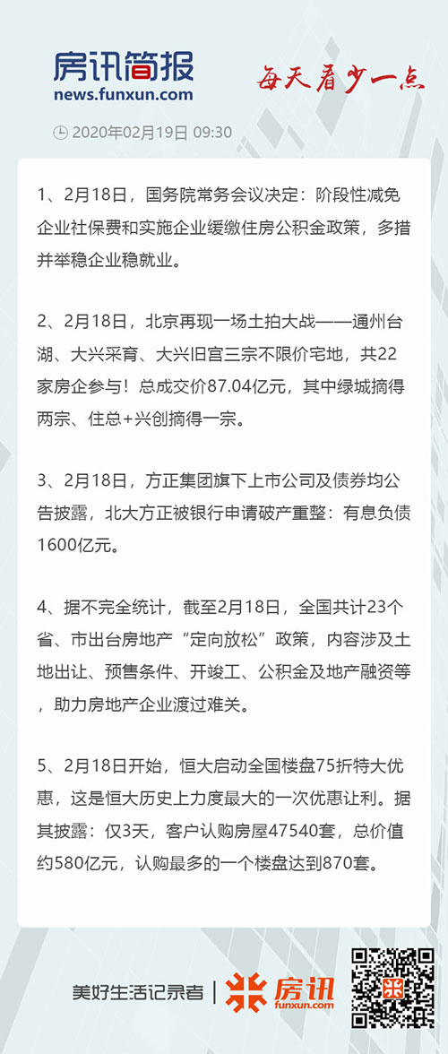 ●2月18日,國務院常務會議決定:階段性減免企業社保費和實施企業緩繳住房公積金政策,多措并舉穩企業穩就業。