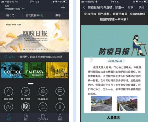 中糧健康科技園還借助中糧“3C運(yùn)營(yíng)體系”,充分發(fā)揮COFFICE管家APP功能,線上線下聯(lián)通聯(lián)動(dòng),在疫情持續(xù)期,創(chuàng)新服務(wù)模式,做好運(yùn)營(yíng)服務(wù)工作。