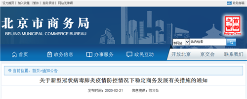 房訊網訊 2月21日,北京市商務局發布《關于新型冠狀病毒肺炎疫情防控情況下穩定商務發展有關措施的通知》,深入貫徹落實市委、市政府關于新型冠狀病毒肺炎疫情防控工作部署,全力做好商務領域疫情防控工作,幫助企業經營,服務市民生活,穩定經濟運行。