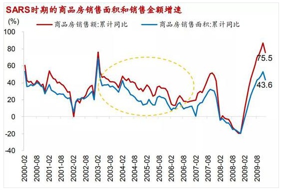 回顧2003年,SARS疫情對商品房銷售的沖擊相對較小。這主要是因為加入WTO后,我國的宏觀經濟和房地產市場均處于高速發展期。SARS爆發并未使商品房銷售增速出現顯著變化。2003年5月商品房銷售面積同比增速為37.5%,且較4月增速環比提升了1.1個百分點。SARS疫情過后,商品房銷售增速出現小幅回落。這主要是由于在房地產市場過熱的背景下,央行出臺了《關于進一步加強房地產信貸業務管理的通知》,收緊了按揭貸款等房地產相關貸款。而后,在2003年8月,國務院出臺了《關于促進房地產市場持續健康發展的通知》,明確將房地產行業定位為國民經濟的支柱產業,由此房地產行業進入快速發展時期。