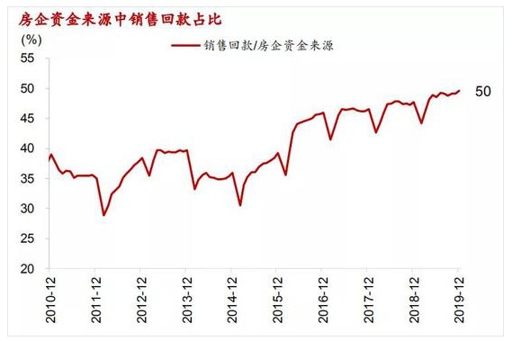 銷售下滑對房企資本開支造成拖累。當商品房銷售金額增速回落時,房企的投資決策將趨于謹慎,投資速度亦趨于下降。這是因為銷售回款是房企資金來源的“主動脈”。房企普遍具有高杠桿的特征,2019年三季度,A股上市房企的資產負債率(總資產/總負債)高達80.6%,僅次于金融業,這使得現金流成為了房企的生命線。而在在房地產調控政策持續收緊影響下,銀行貸款與信托融資來源大幅收緊,銷售回款對于房企的重要性日趨上升,目前占比已達50%,是房企資金來源中的最大項。