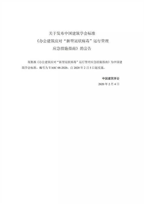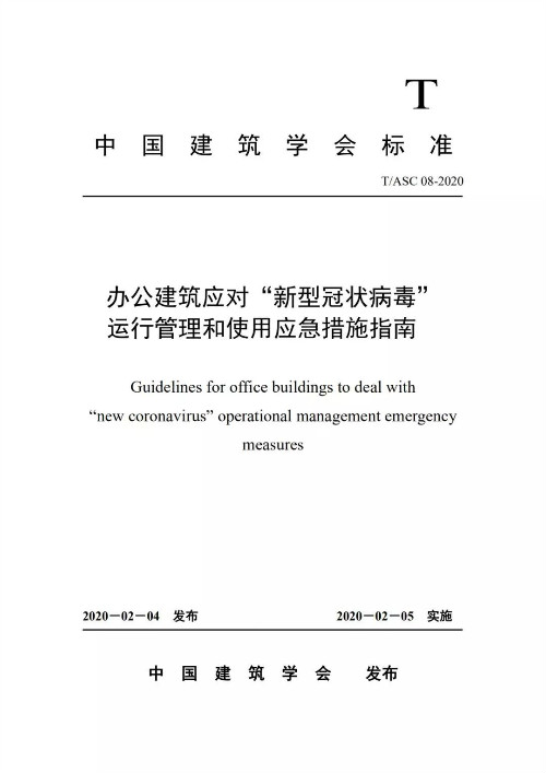 房訊網(wǎng)訊 2月4日,中國建筑學(xué)會(huì)發(fā)布公告,批準(zhǔn)《辦公建筑應(yīng)對(duì)“新型冠狀病毒”運(yùn)行管理應(yīng)急措施指南》為中國建筑學(xué)會(huì)標(biāo)準(zhǔn),編號(hào)為T/ASC 08-2020,自2020年2月5日起實(shí)施。