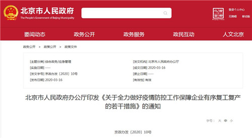 北京市人民政府辦公廳印發《關于全力做好疫情防控工作保障企業有序復工復產的若干措施》的通知