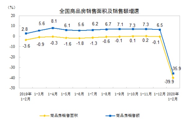 1—2月份,商品房銷售面積8475萬平方米,同比下降39.9%。其中,住宅銷售面積下降39.2%,辦公樓銷售面積下降48.4%,商業(yè)營業(yè)用房銷售面積下降46.0%。商品房銷售額8203億元,下降35.9%。其中,住宅銷售額下降34.7%,辦公樓銷售額下降40.6%,商業(yè)營業(yè)用房銷售額下降46.0%。